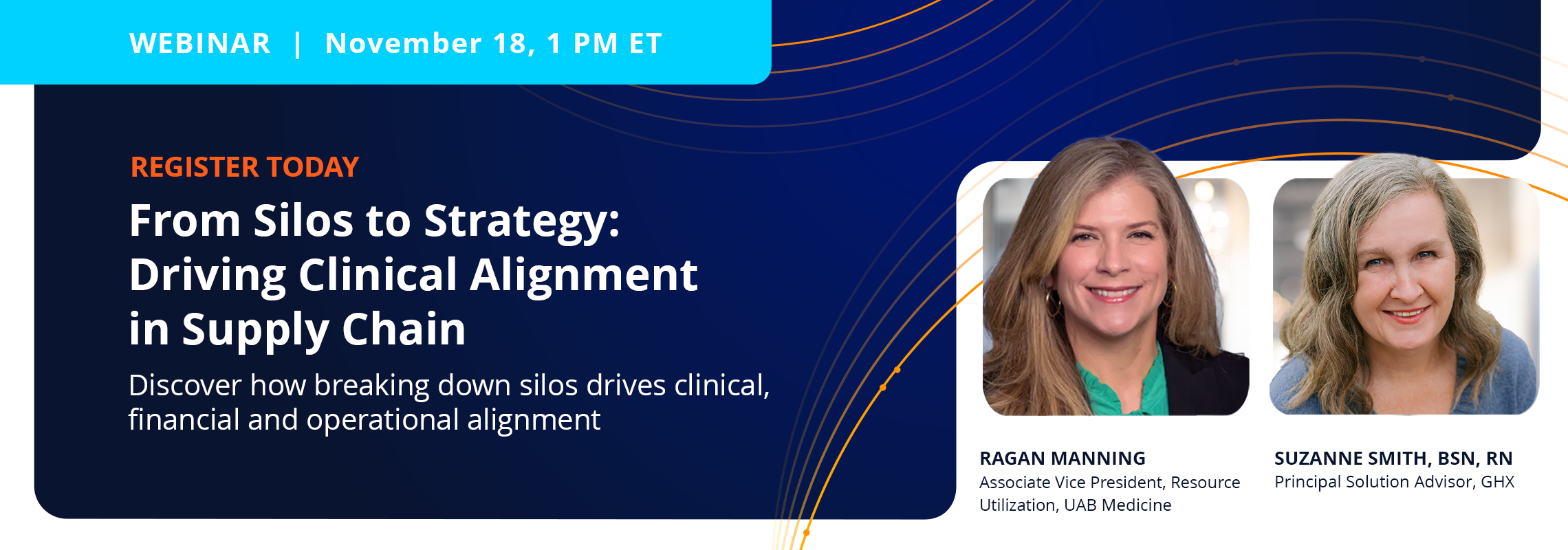 Join us for this 60-minute webinar featuring Ragan Manning, Associate Vice President, Resource Utilization, UAB Medicine, and Suzanne Smith, BSN, RN, Principal Solution Advisor, GHX. Ragan will share how she reshaped governance structures and connected clinical insights with sourcing and evaluation strategies to build trust and drive lasting improvement in her health system.
